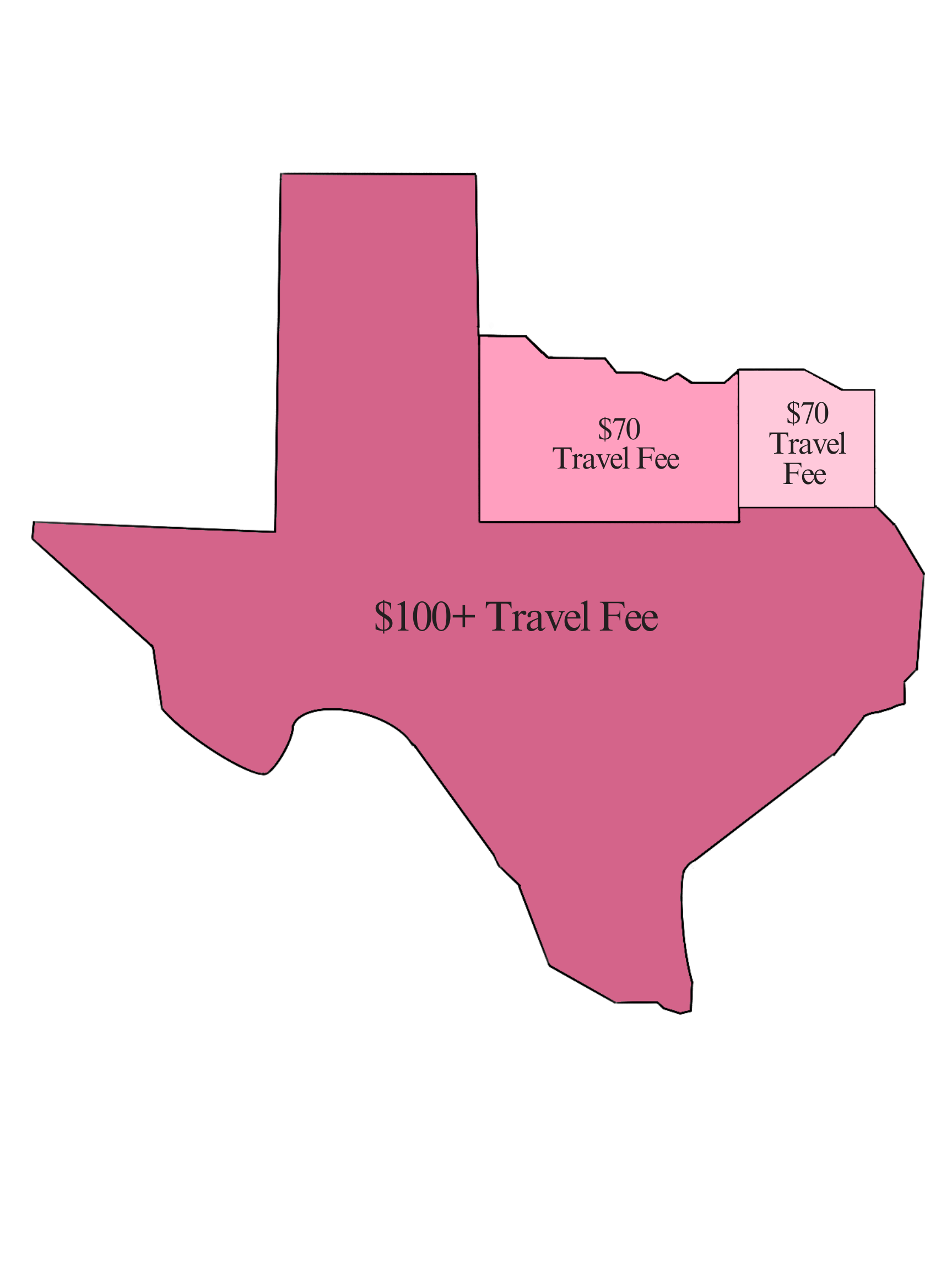 Our standard travel rate covers a wide area of the DFW, ETX, and OK metro but we can also travel to more remote areas for a premium travel rate. Needing us to travel out of state or beyond? Email us for a custom travel quote!